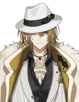 Luca has flowing blonde hair with a side ponytail underneath a white hat with a black band. His eyes are a light purple and he wears a pinstripe suit.