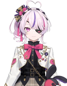 She has short light silvery hair with pink and purple streaks in a ponytail and a heart shaped ahoge with a pink eye and eyepatch. She has a short white jacket with long sleeves and multiple pins with a black top and light plaid skirt with mismatched stockings.