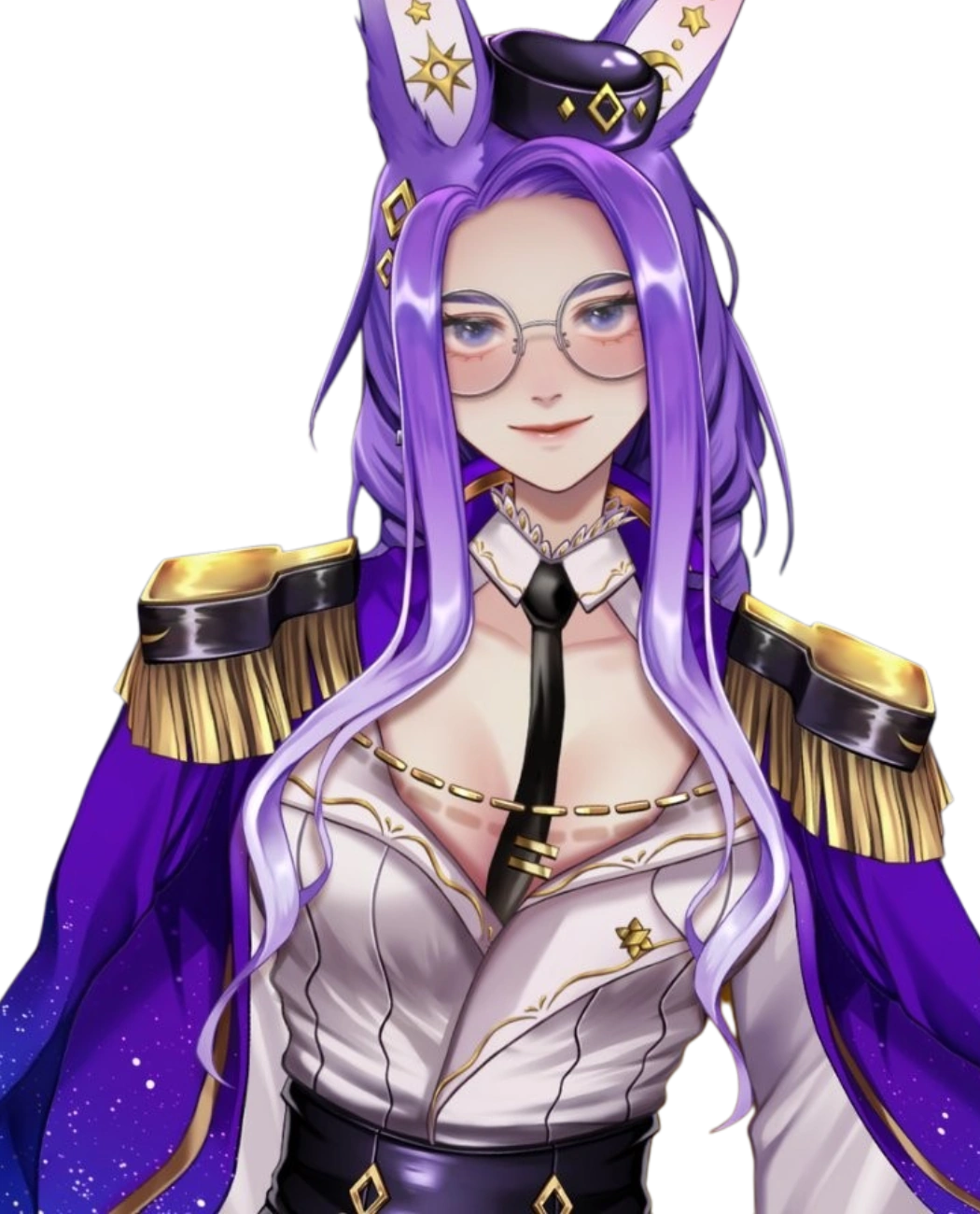 Meera Octavia is a bunny-humanoid hybrid with long, flowing hair in a rich violet-purple color styled neatly braided to cascade down her back with voluminous strands framing her face. She has light blue-ish eyes and her face is adorned with round glasses. She wears a small, tilted military-style hat that nestles between her rabbit ears which is adorned with golden accents, such as diamond-shaped designs and celestial motifs (like stars and the sun).