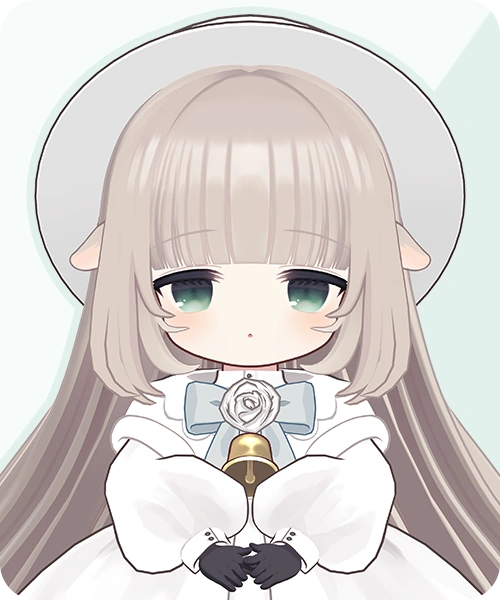 She has long, light hair with animal ears and light blue green eyes. She wears a mostly white coat with grey buttons and a bell with black heels.