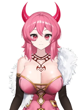 Mikki adorns herself with distinct features that make her stand out. Atop her head, she proudly wears pointy red horns, complemented by a cascade of medium pink hair that gracefully flows down. Her unique hairstyle includes two front strands that transform into delicate curls, framing her face just above her mouth on either side. With a touch of anime-inspired aesthetics, her reddish-pink eyes captivate attention. Mikki's complexion is fair, adding to her enchanting appearance.