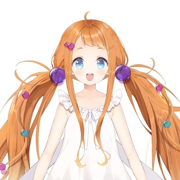 She has long, orange-brown hair arranged in twintails, while her eyes have blue irises. She has several blue and pink hair accessories adorning her hair, and she wears a white frilly dress. She also has a toggle for a pastel see-through jacket.