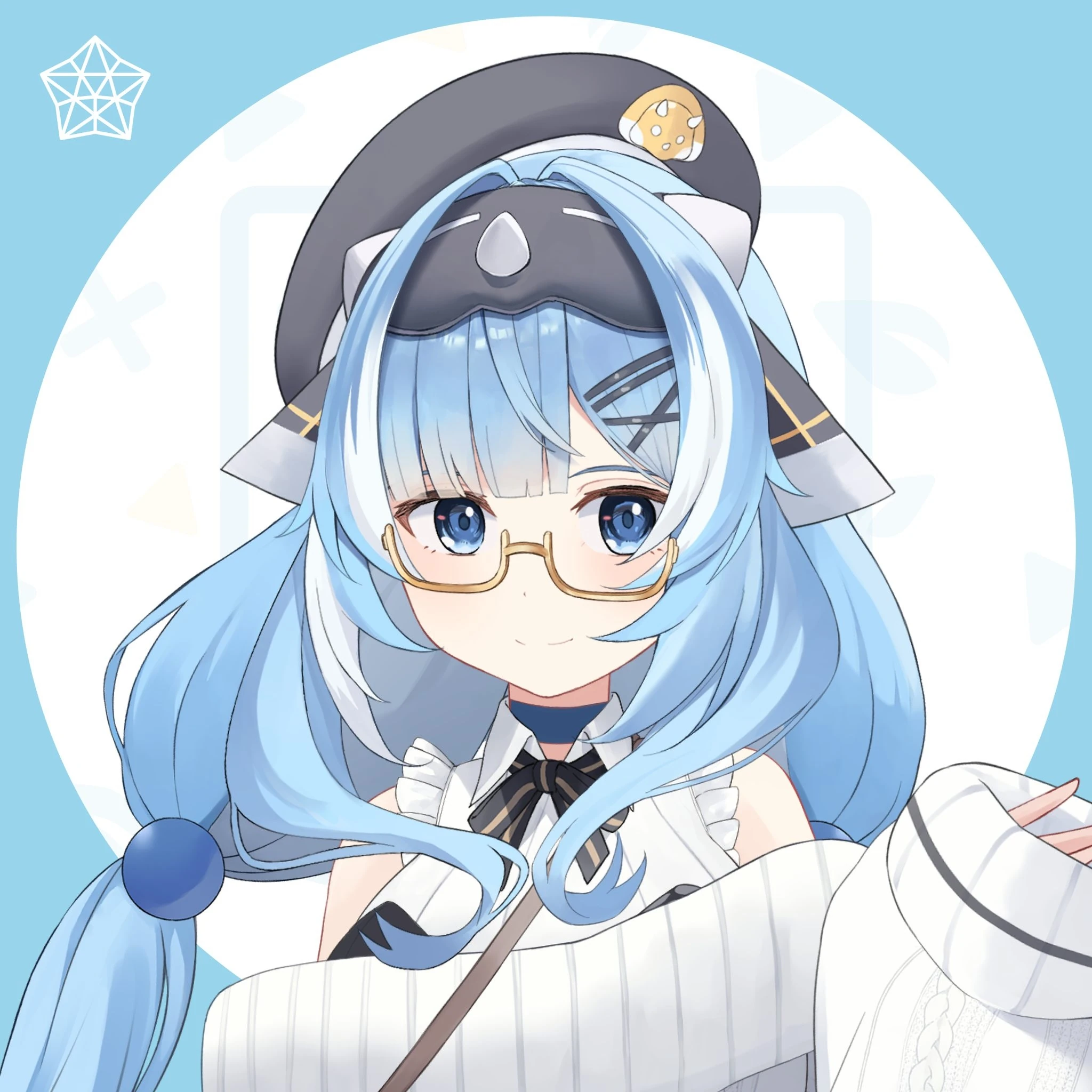 She has long light blue hair with white highlights at the ends in a twintail hairstyle. Her eyes fade from blue to light blue, and she wears yellow square glasses with rounded corners.