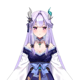 She has long purple hair with silver horns and light pink eyes and a dark purple flower-like hair accessory with a tassel.