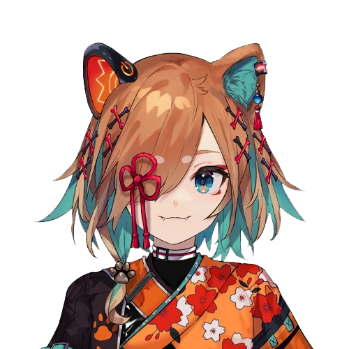 Her top exposes her midriff slightly but is otherwise traditional inugami clothing, which is orange and black and adorned with white and red flowers and orange paw prints. Her lower arms have long, partially transparent sleeves with long turquoise ribbons.