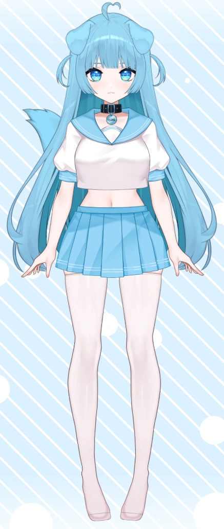 She wears a white and light blue cropped sailor uniform top with short sleeves and no typical bow in front. Ob her lower body she is covered by an equally light blue skirt, with white socks that reach up her thighs and no shoes, which is a running joke on her channel. Her skin is pale, and she has blue markings under her eyes that glow in the dark and change color depending on situation or mood. Her eyes are light blue without visible pupils, and they too can shift to red depending on her mood. Her nails are the same shade of blue as her hair, ears and tail.