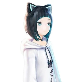 She has short, bobbed dark hair with short blunt bangs and a teal-ish blue underneath light blue ears with cat-ear shaped speakers. She has a white hoodie with black and blue striped drawstrings and black collar with a round dark blue charm.