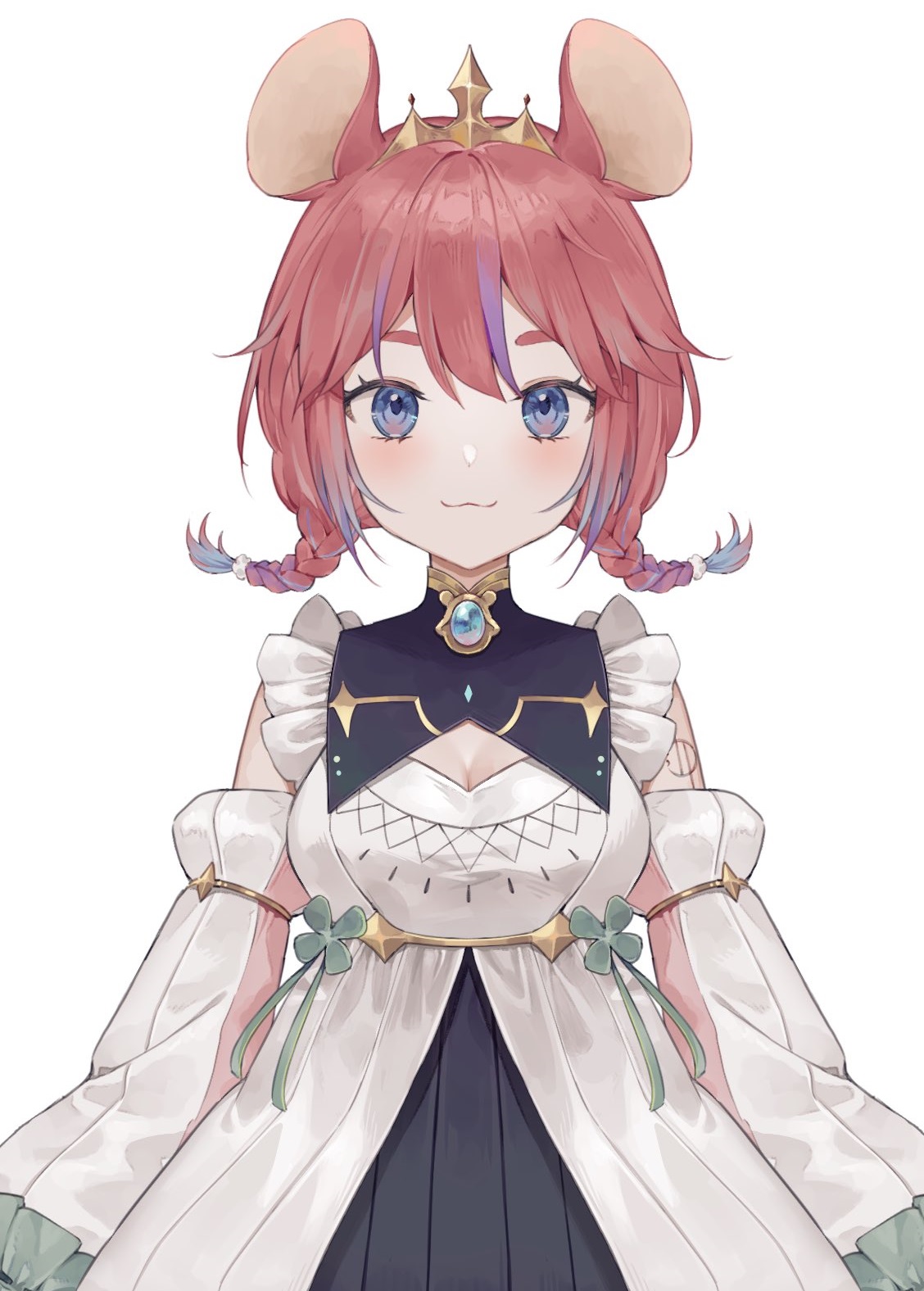 She has short pink hair with tiny braided pigtails that has light purple at the end/tips and pastel blue-purple eyes with mouse ears and a gold crown. She has a mostly white dress with dark blue accents and two clover ribbons. She has long white boots with dark blue accents and pink and green arrow shaped markings and one golden laurel over one foot.