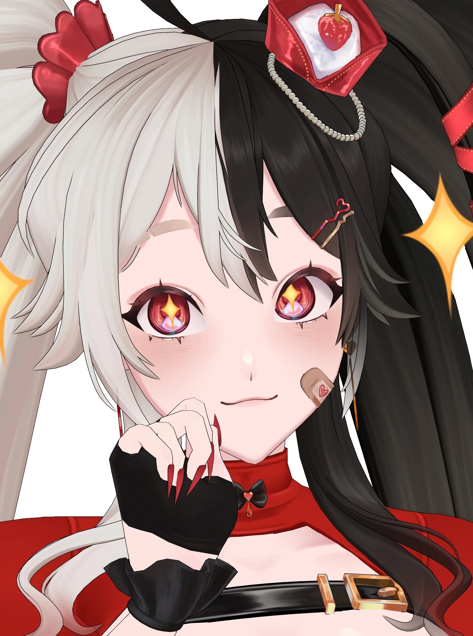 Momotexx has hair that is half black and half white, and sits at varying lengths depending on her preference; she also has a black, heart-shaped ahoge and red eyes. Her hat is comprised of folded red fabric with a strawberry resting in the middle, pearls hanging from it. She sometimes does her hair up in pigtails which are held by red scrunchies. Her fingernails are painted red.