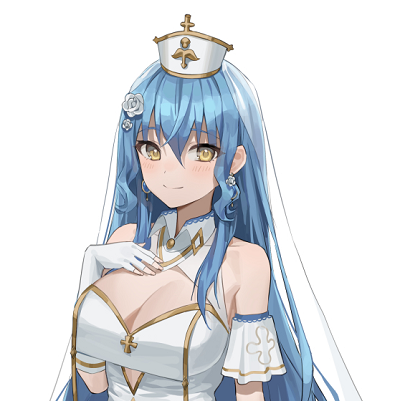 She has long light blue hair with two wavy strands in the front and light yellow eyes with white rose hair accessories and a white and gold hat with a veil.