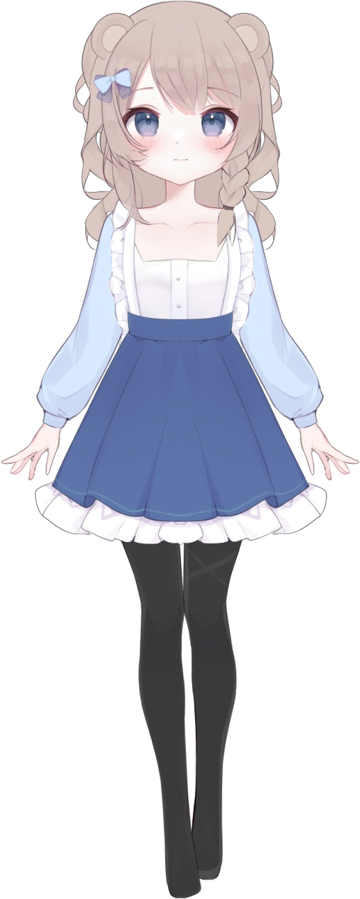 Previous model: She has long blonde hair, bear ears and blue eyes. She wears a blue dress, white blouse and black stockings. She regulary dresses up as the main character of the game she is playing.