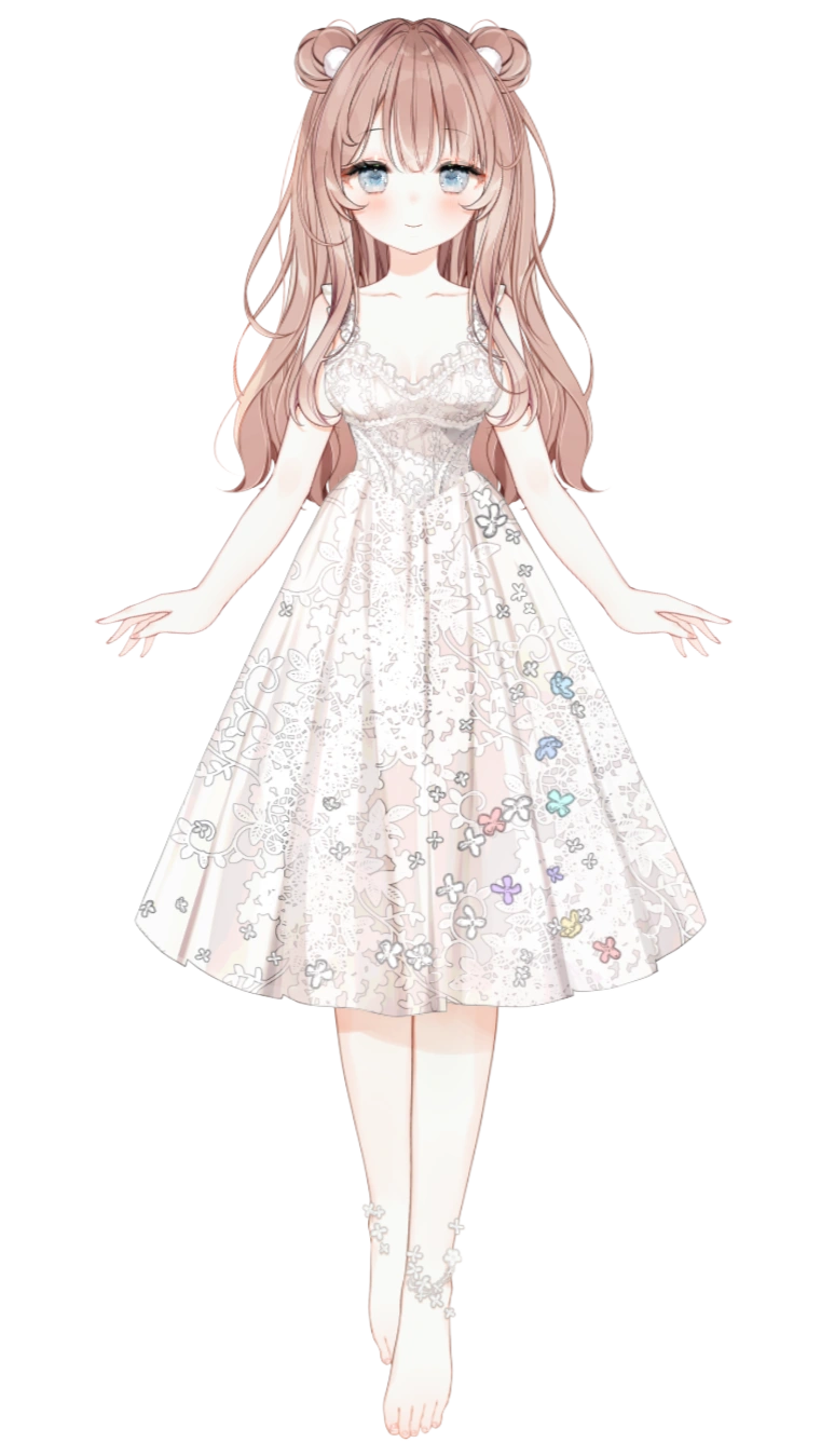 New model: She has long light brown hair with buns that imitates bear ears and sparkly grey-blue eyes with tiny white bear head inside. She wears a white dress with flowers on it. She's bare-foot.