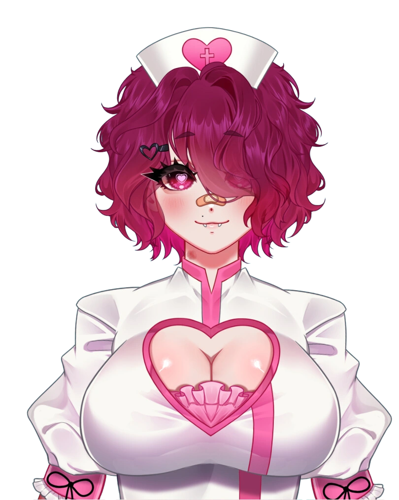 She has deep pink fluffy/wavy hair with bangs covering her eyes, a black heart hair clip and white nurse cap, and dark pink eyes with a bandage over her nose. Her nurse dress has a heart shaped 'boob window' with frills in the middle of her cleavage.