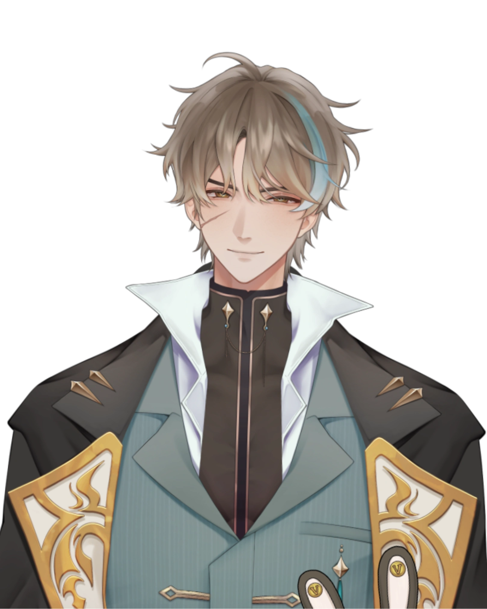 Noctus is a Time Detective sent from the Congenium to solve problems residing within the flow of time. He has broken-blonde hair and light orange eyes, as well as a blue strike of hair on his left. He has a scar in the right which was caused by a time incident. He's usually seen wearing the Detective Agency's signature outfit, Timeslayer, which features an embroidered golden-black coat and a vest, above the suit's actual protective layers.