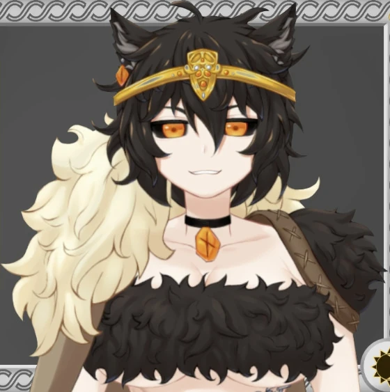 She has short, dark fluffy hair with orange eyes and animal ears with a golden circlet.