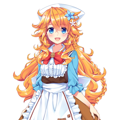 She has long, vibrant wavy blonde hair with a braid and blue eyes and a white hat with a blue and white flower hair accessories. She has a brown dress with blue sleeves and white apron.