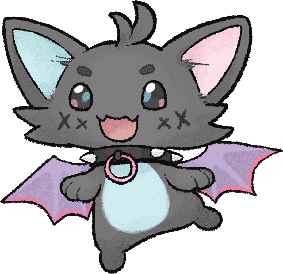 Penko’s mascot goes by the name of Kororinpa, or Rinpa for short, and is the embodiment of her beloved fans. Rinpa has the appearance of a small bat/dog hybrid with dark fur, dark beady eyes, and a sky-blue belly. It has wings similar to a bat with a large, black, spiked collar around its neck, which contains a single pink ring on the front. Rinpa’s ears are colored to match Penko’s eye colors, with their right ear being sky blue and their left ear being pink. They have scars on their cheeks which originate from a rough past, but even so, they do their best to remain upbeat and happy due to the comfort and love of their leader Penko.