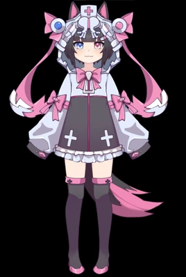 She has dark-colored hair that is cut short, with a hairpin over her left eye in the shape of a pill. Her eyes themselves are heterochromatic, with the left being a light pink colour and the right being a sky blue. Atop her head are two pointy puppy ears with a pink colored inner ear, which move and bounce depending on her expression and mood.