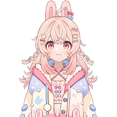 She has medium length rosy-blonde hair with braids and an ahoge and short rabbit ears with various cutesy accessories. Her eyes are pink and she wears a cutesy pastel jacket with rabbit patterns and soft colors. She has light blue and pink rabbit slippers.