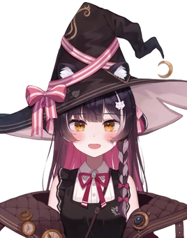 She has long, dark purplish hair with pink underneath with a single braid that has a lighter shade in it with two pink hairbows and yellow-brown eyes. She wears a large dark witch hat that has animal ears sticking out with a pink and white striped bow.