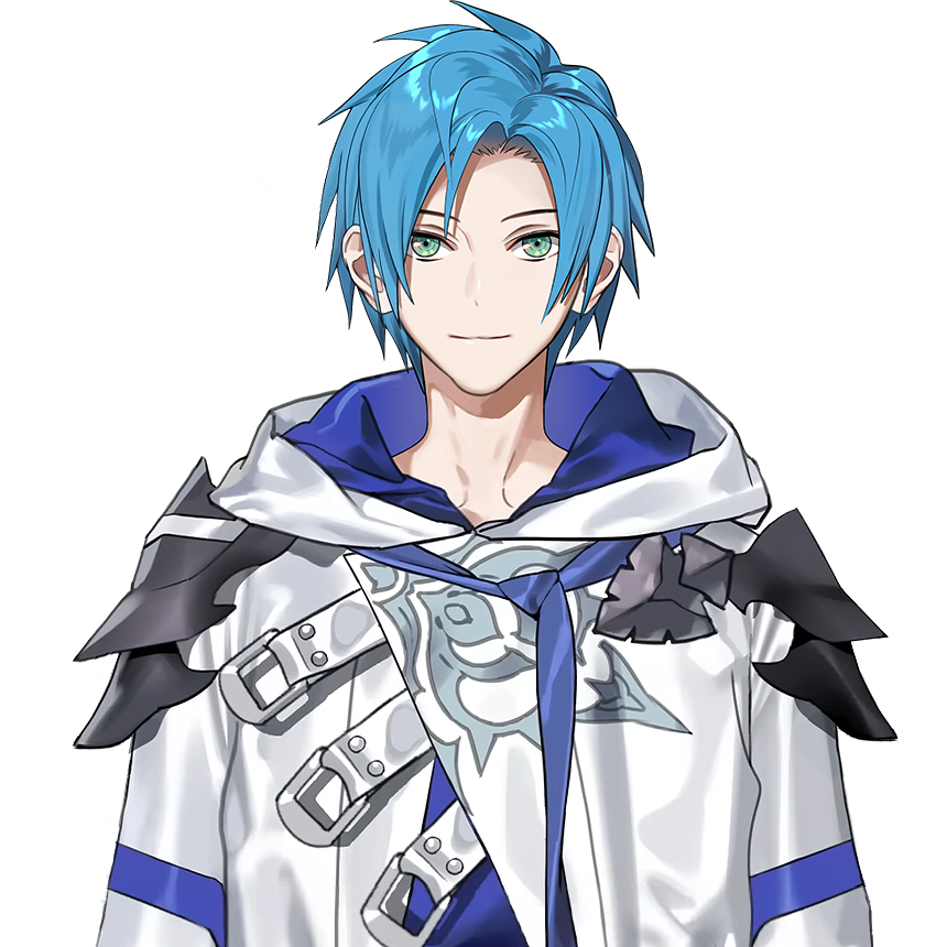He has short parted blue hair with light green eyes and a silvery-blue colored jacket.