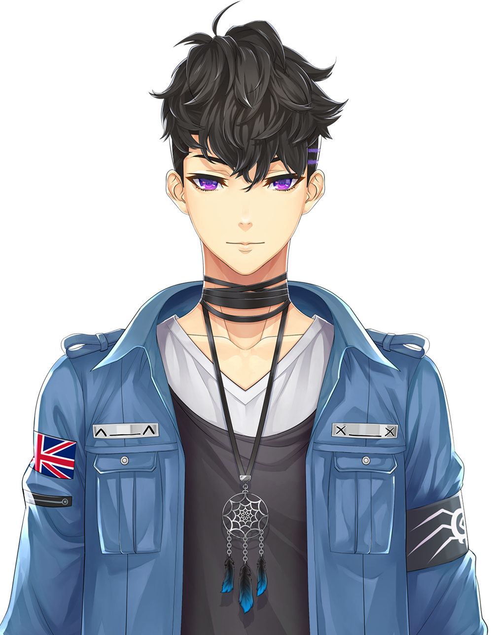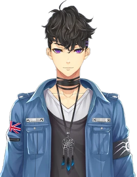 He has light, pale skin and short frizzle permed black hair with purple eyes. He wears a dream catcher necklace with blue feathers.