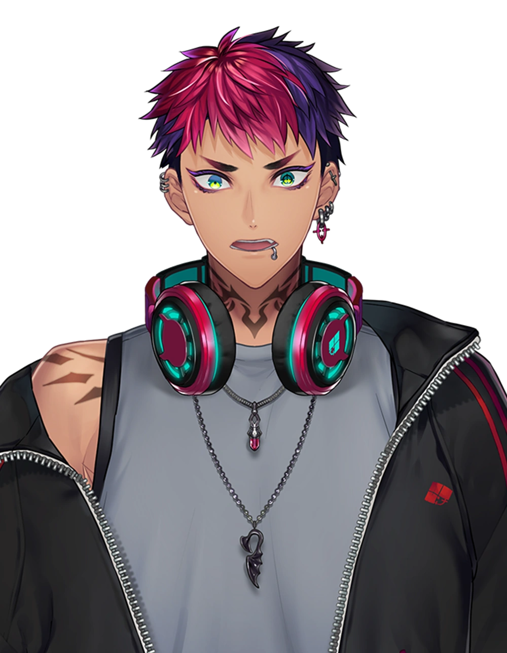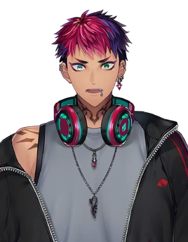 He has dark skin with short bright dark pink hair with purple and blue-green eyes with ears and lip piercings.