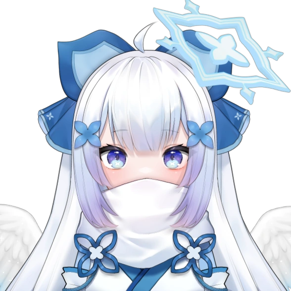 Risa is a guardian snow angel with a cute and cheerful appearance. She has long, white hair that is usually tied up into two twintails with blue-purple tips reminiscent of the aurora borealis. She has blue-purple eyes with a white flower highlight in each of them. She stands at about 5'2½" and has a slender figure. She usually wears a white dress with a blue sash, along with a white scarf that she often uses to hide her face behind. She has a pair of white angel wings on her back in addition to a white halo with four perpendicular spikes and a four-petaled flower inside of it. She has a blue hairbow on her head and two blue hairclips on either side of her head, in the shape of the same four-petaled flower. Risa is often seen with a cheerful smile on her face and her soft nature and bubbly personality is reflected in her appearance.