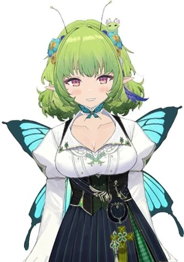 She has short fluffy light green hair with pointed ears and light purplish pink eyes. She has blue monarch butterfly wings.