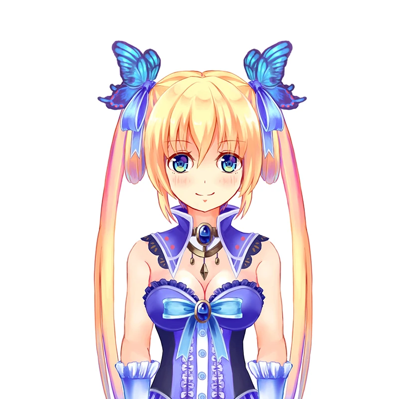 She has blonde hair and pale skin, with a blue frilled outfit and blue collar. she also wears gloves and two butterfly bows.
