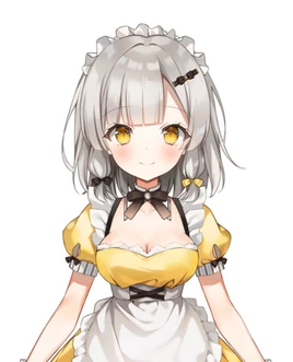 She has short silver hair with two subtle pigtails in black and yellow ribbons and yellow eyes and a black blow hairclip. She wears a yellow with white apron maid dress.