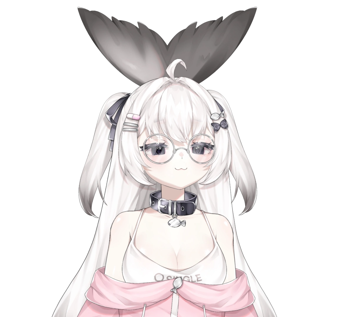 She has long white hair in twintails and black hair ribbons and hairclips and black eyes with a tail.
