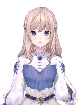 She has long, light blonde hair with side-braids and light blue eyes. She has a long sleeved white shirt with blue top and beige skirt.
