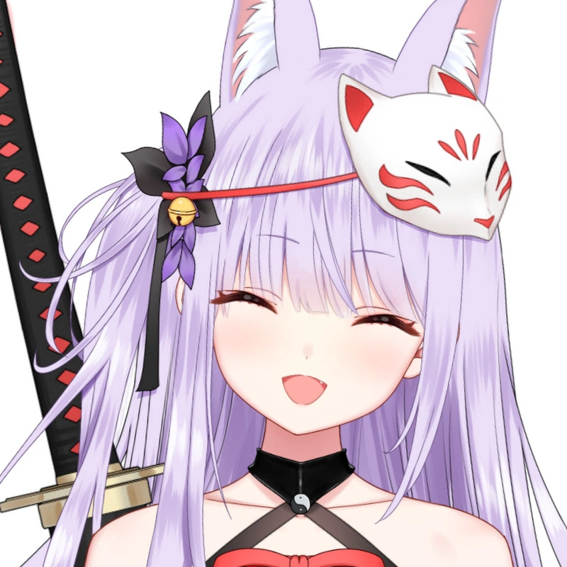 Natsume has long, light purple hair with fox ears and eyes with cherry red irises and a fox (狐, kitsune?) mask adorning her hair.