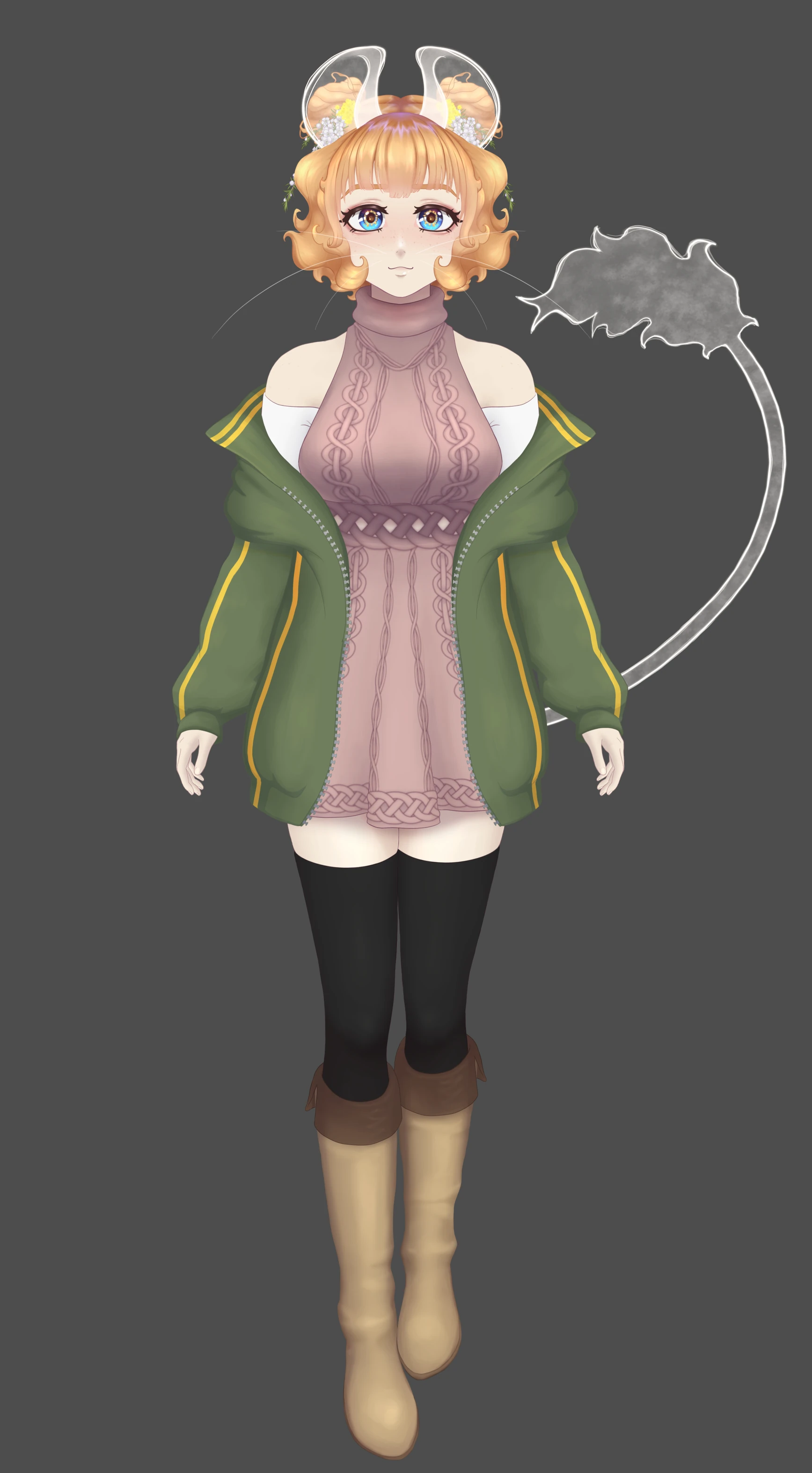 She appears as a short curly-haired strawberry blonde girl with a set of spectral mouse ears and a tail, both of which are relevant to her lore (lore video on her YouTube channel), with a sleeveless pink dress and green jacket with yellow stripes, black thigh highs and brown boots; she also has a more chibi form and a small brown mouse form (a dusky hopping mouse), a ghost form, Halloween version, a Pawmi Pokémon Hoodie, a goth form and maid outfit.