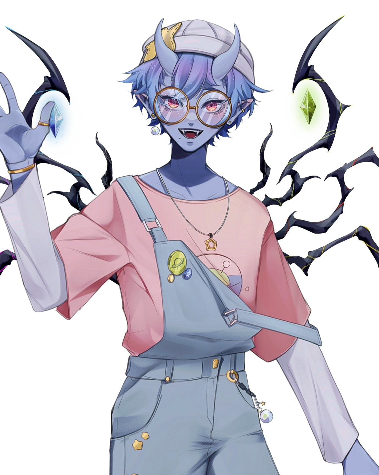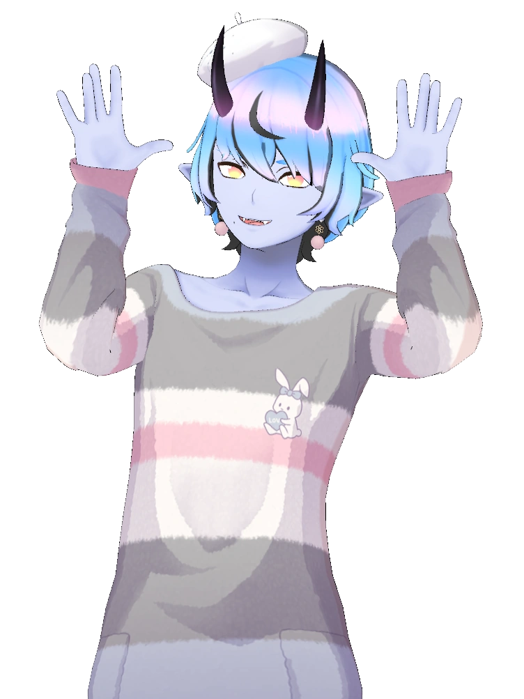 Stiggy’s design was created in collaboration with character designer ZAKNE_, resulting in a distinct and visually striking aesthetic. He is a tall, athletic humanoid with blue skin and an elf-like appearance, complemented by two prominent horns on his forehead. His hair is a medium-length blue with pink accents, topped by a white beret adorned with a star emblem.
