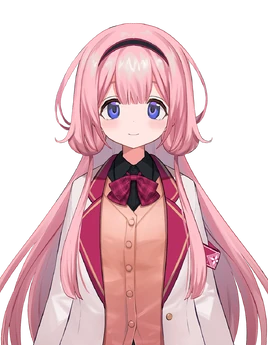 She has long pink hair with a black headband with a red outline and twintails, and blue eyes. She wears a white blazer with inner dark pink folds and a light coral button up cardigan.