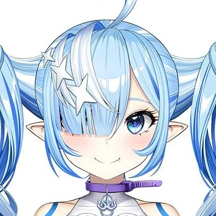 She has long, light blue hair in pigtails with pointed ears and light blue eyes. She has an ahoge and her bangs covering half her face with white x shaped clips.
