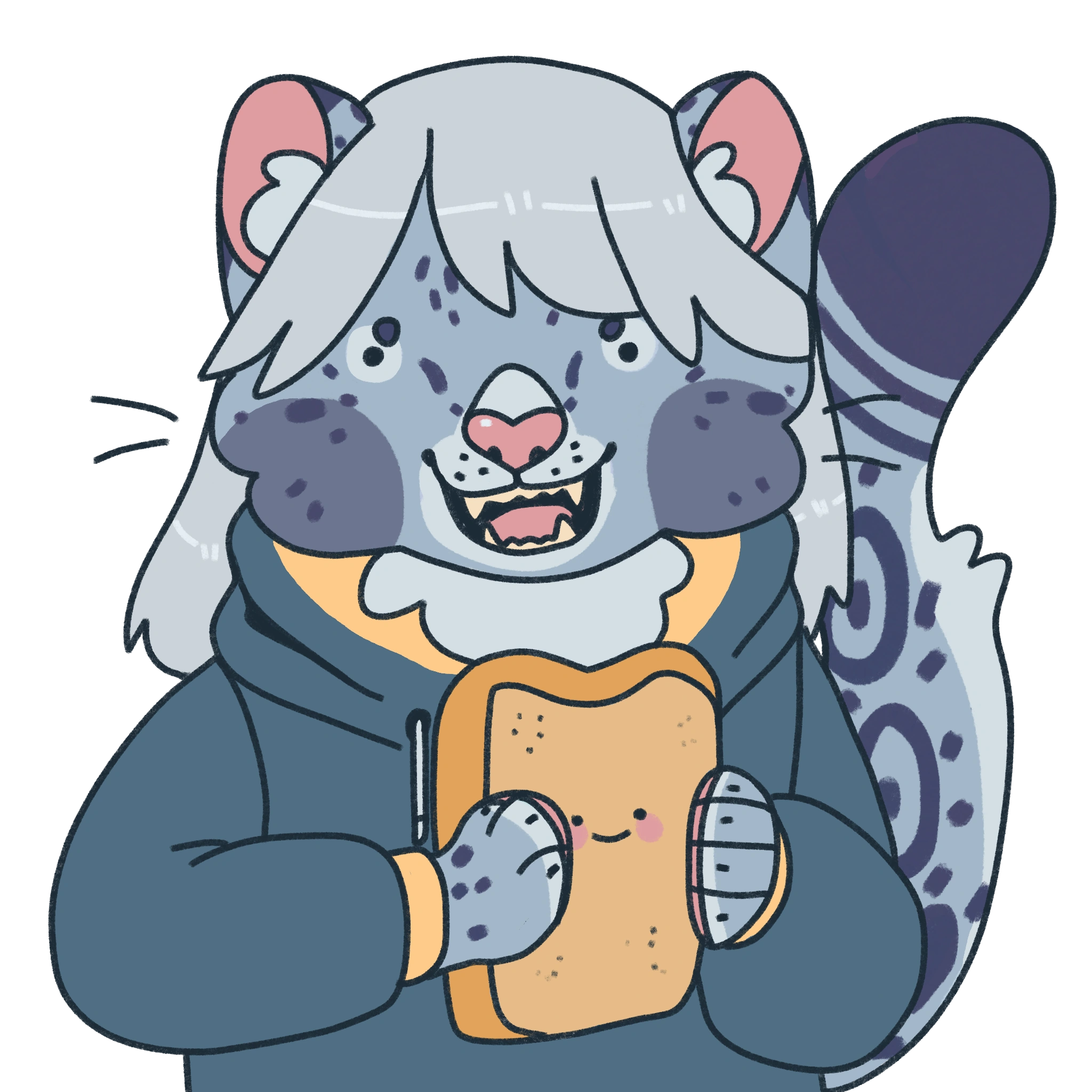 Toast is a snow leopard with white hair, silver eyes, and soft feline features. She often wears comfy clothing, most notably a tan hoodie when relaxing at the Tavern. Her design blends warmth and approachability, slightly conflicting the cozy-chaotic atmosphere she cultivates.