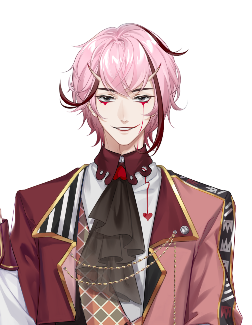 He has short pink hair with two strands sticking out and red streaks with a grey eye and a white eyepatch with a heart on it.