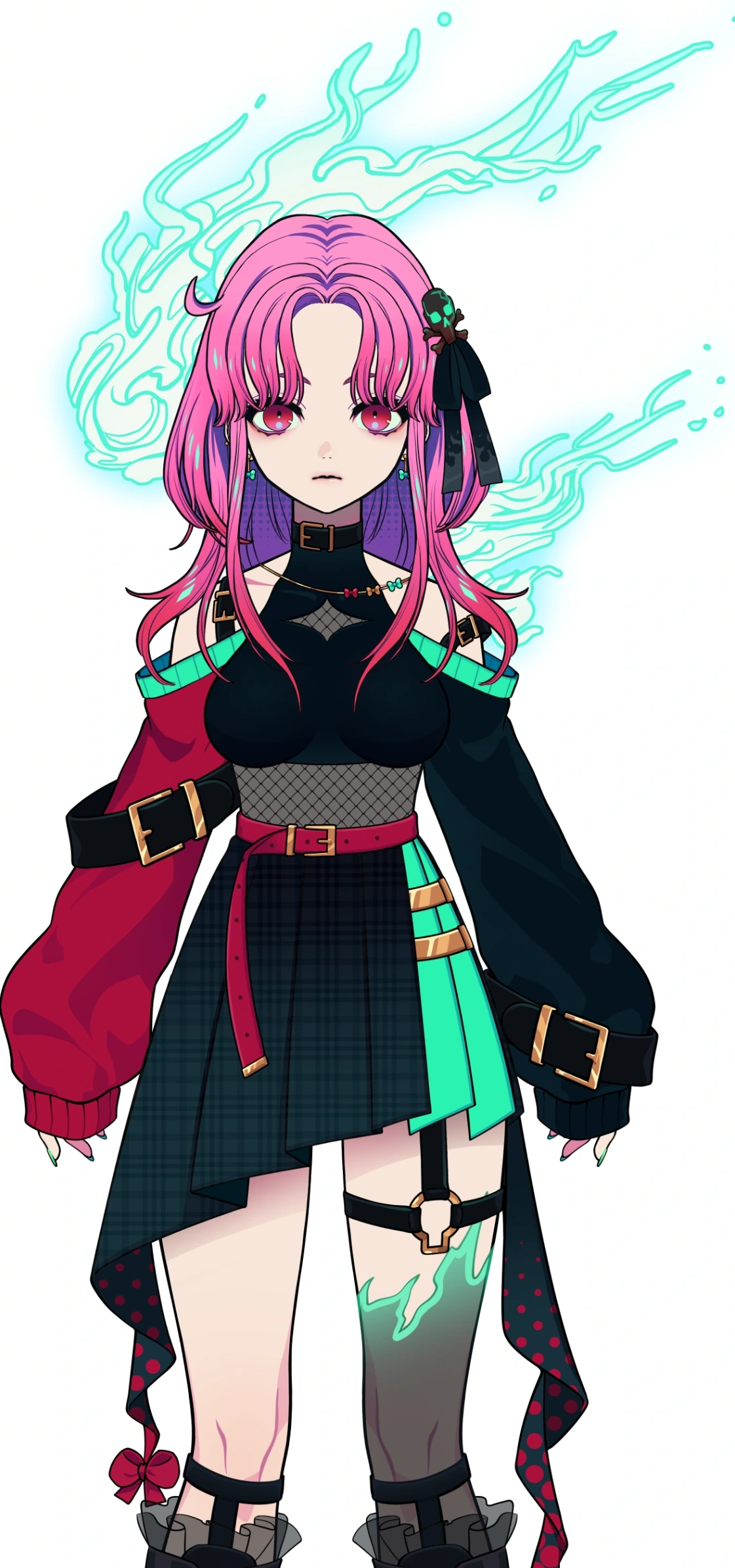 She has dark, slightly wavy hair that goes past her shoulders with even darker pink eyes.