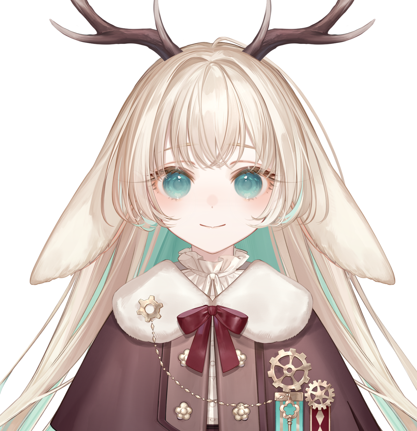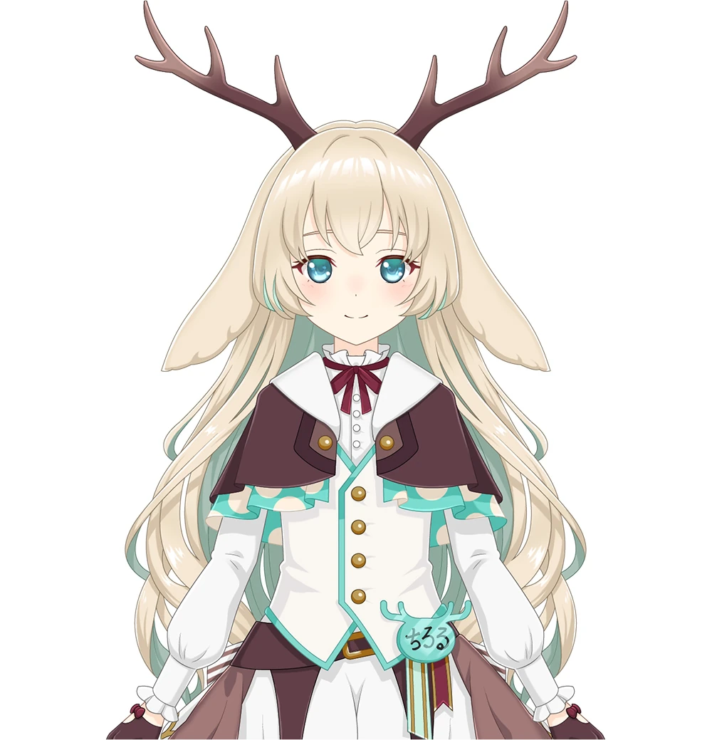 She has long, light blonde hair with antlers and blue-green eyes. She has a brown and white dress with blue accents and a blue simple jackalope headshot badge with her name written on it in hiragana.