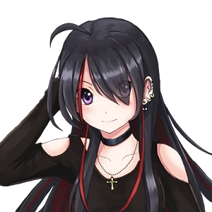 Miki has long black hair with red highlights. Her hair partially covers her left eye, and her eyes have purple irises.