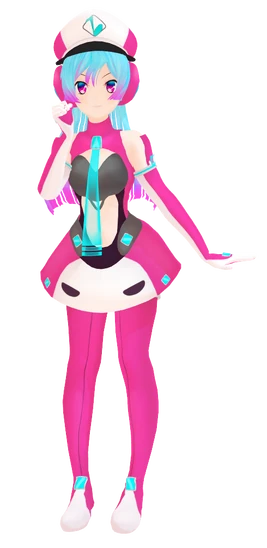 VIBE has long, light blue hair with pink-colored tips, pink eyes and her clothing is a modern idol-style suit with a grey chest plate. Her signature item being her cap with a musical note on the top of it.