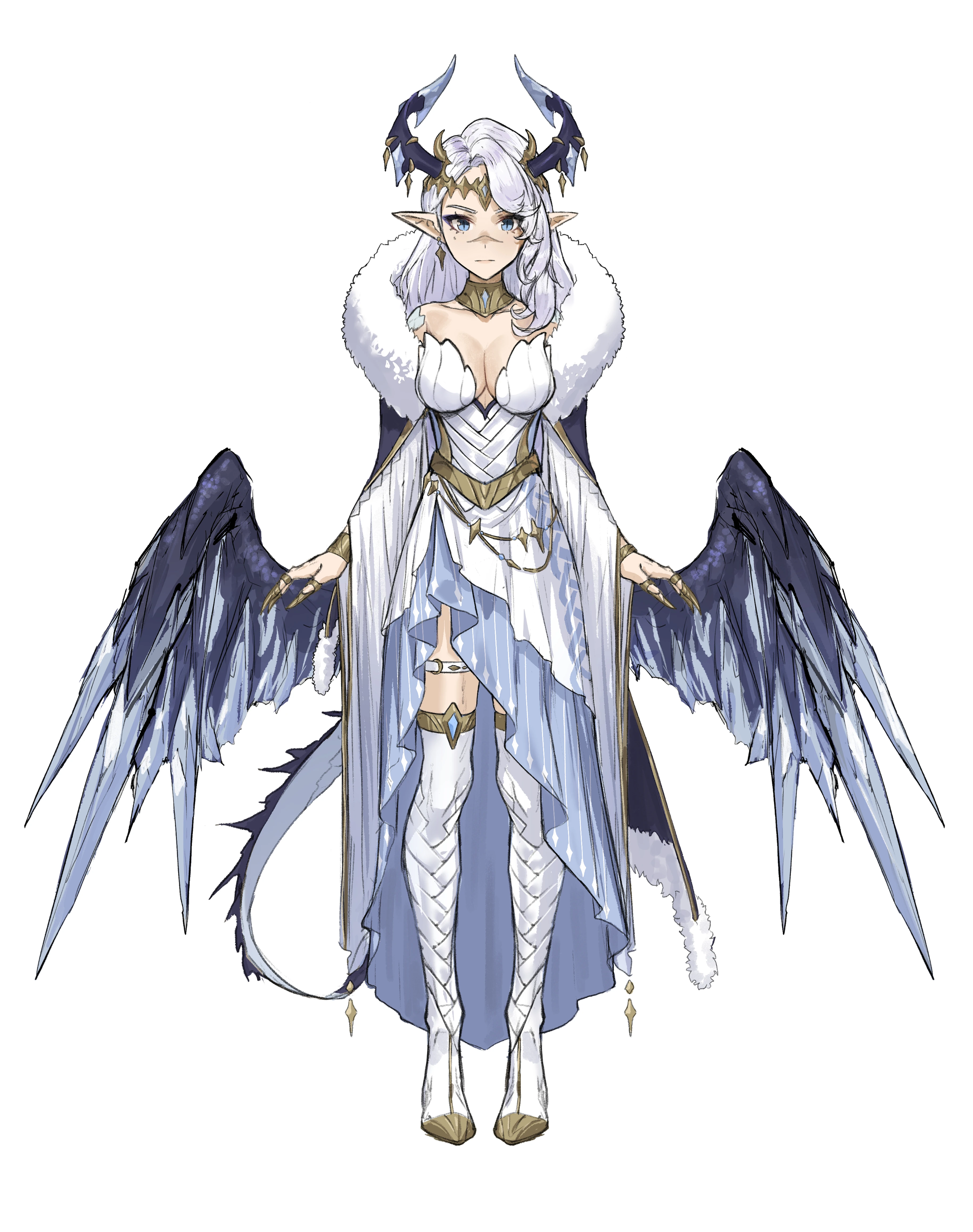 Chisei worked on her initial character design with freelance illustrator Daniel Deng. She is elf-like in appearance, sporting a tall, athletic, pale build with pointy ears. She has light blue scales on her shoulders. Her hair is long, side-parted, with hints of light blue and purple that resembles her previous design. She sports a dark blue asymmetrical fur-lined cloak with a golden emblem on the back. She wears a white and blue off-the-shoulder dress with overlapping white cloth, gold accents, and a leg slit. Her sleeves are long and flowy, leading to her hands with claw-like jewelry and rings. Her shoes are thigh-high, resembling the white overlapping cloth on her bodice, accompanied by a garter belt. Her dragon-like features consist of blue dragon-like eyes, razor sharp teeth with elongated fangs, tall dark blue horns with light-blue ice crystals and gold decals, dark blue wings with ice crystal tips that rest on her lower back and can overlap over her body, a light blue tail with tuffs of dark blue spikey hair, and gold claw jewelry.