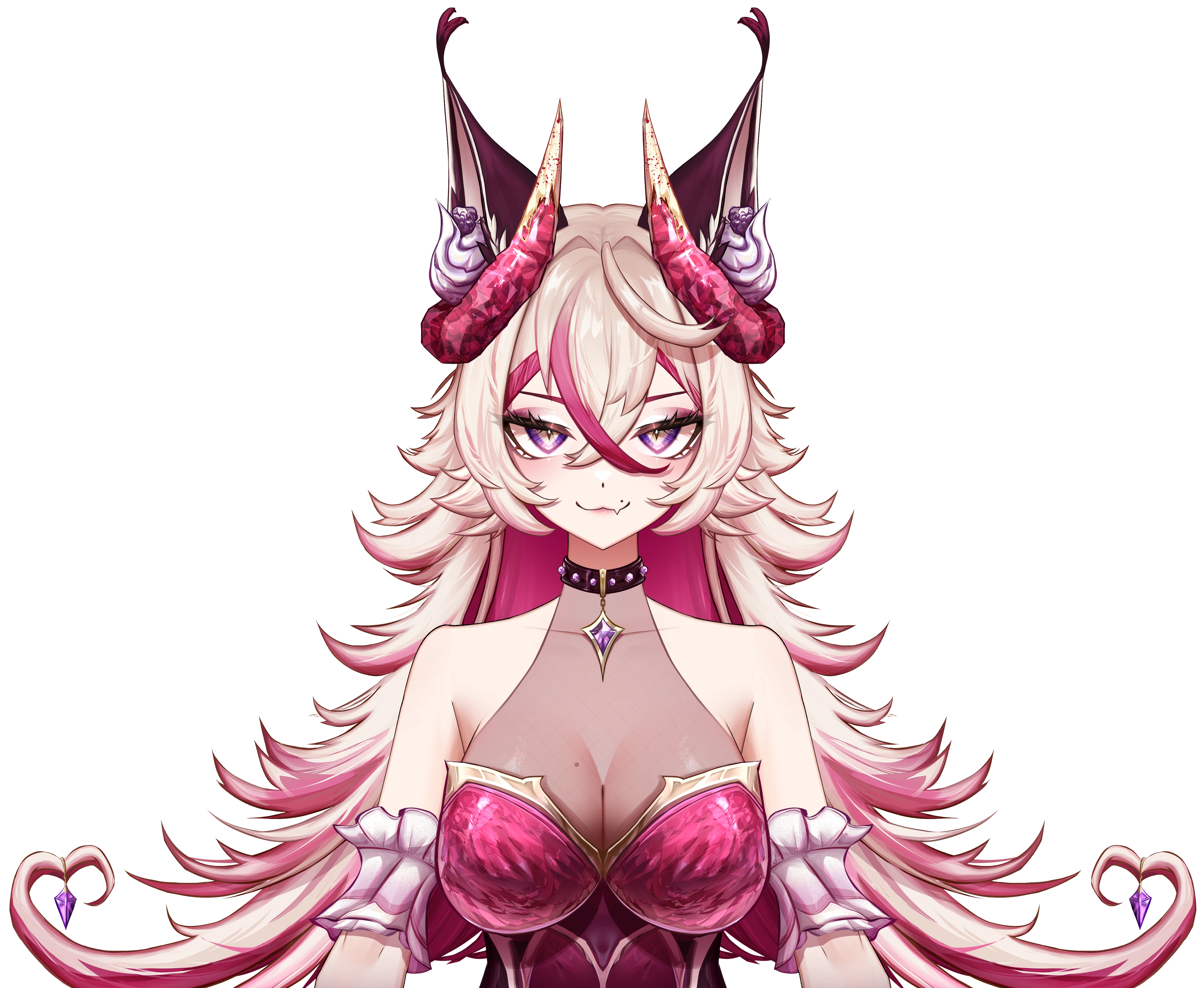 Veli has a super fun and unique look that mixes dessert-themed details with a cute but powerful vibe. Her long, spiky blonde and pink hair is fluffy and wild, with pointed caracal ears and little ear tufts topped with blackberries. She’s got curled horns made of rock candy, with a white chocolate coating at the tips.