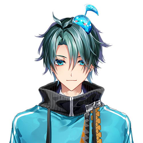 He has short glowing teal hair and light blue eyes with a chibi slime music note on top of his head. She wears a bright light blue jacket with a black turtleneck and large golden zipper that goes down his side and black gloves.