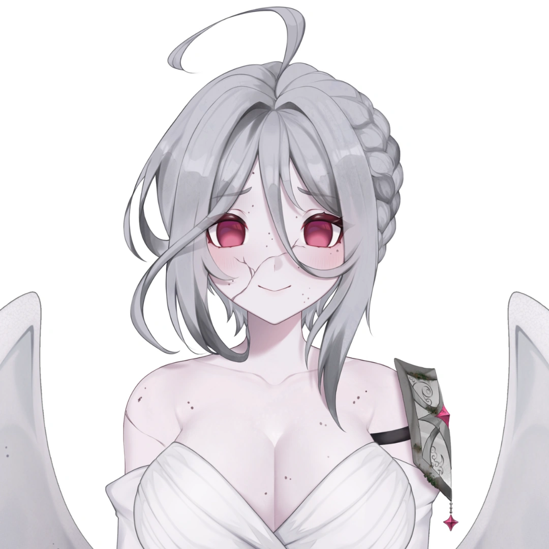 Miyu is a weeping angel girl, she has large permanent stone wings on her lower back with a large crack on her left wing and stone texture freckled on her wings and body. She wears a long white dress wrapped neatly in a sash, her sleeves are drooped and torn with holes. The bottom of her dress is dirtied from time and torn at the end revealing her black flip-flop sandals.