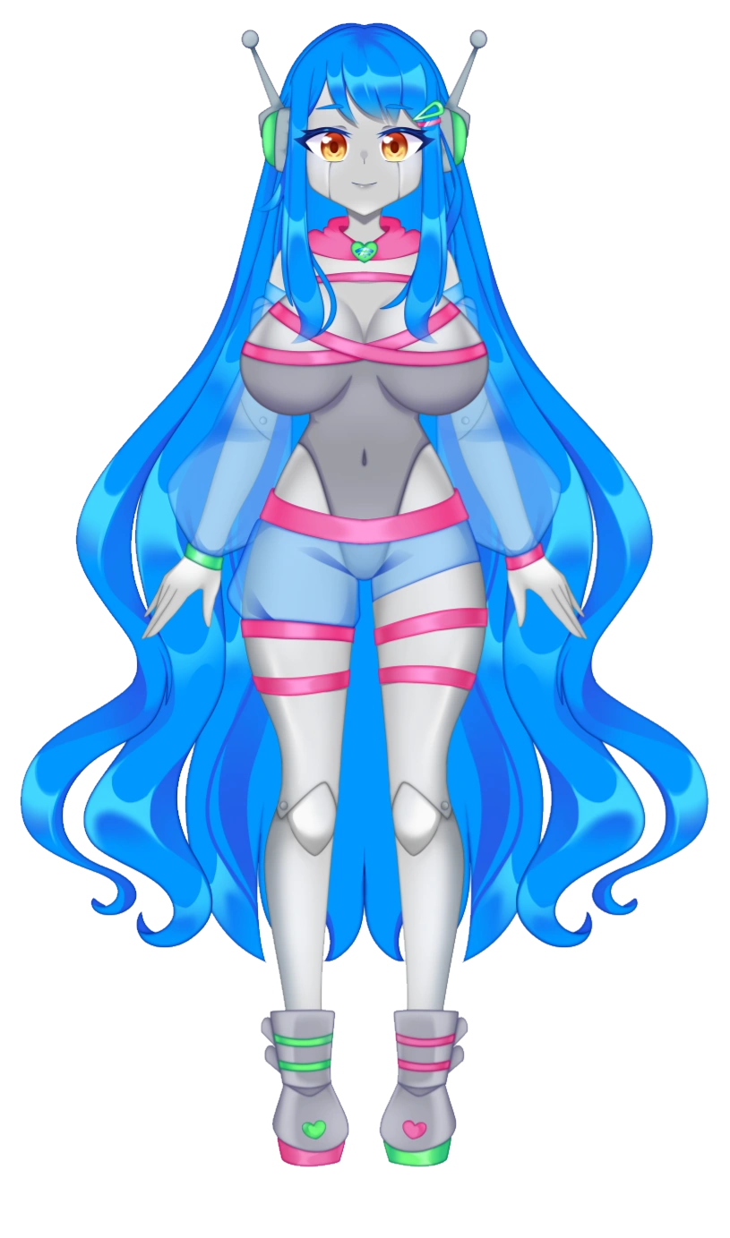 She has very long, light blue hair with a green hair clip and orangey eyes with grey-ish skin and headphone antennas.