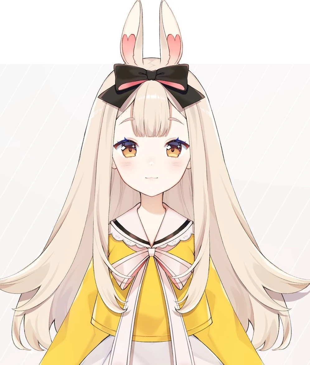 Yenko is a blonde bunny girl with tall ears and yellow eyes. Her hair reaches her lower back, and the edges of her bangs are swept to either side with a large, black bow. She wears a yellow sailor-style top with long sleeves, and a large white bow adorning the front of it. She also wears a white skirt with yellow roses layered across the bottom of it. She wears embroidered thigh-highs and her shoes are black, with white pom-poms sitting at her ankles.